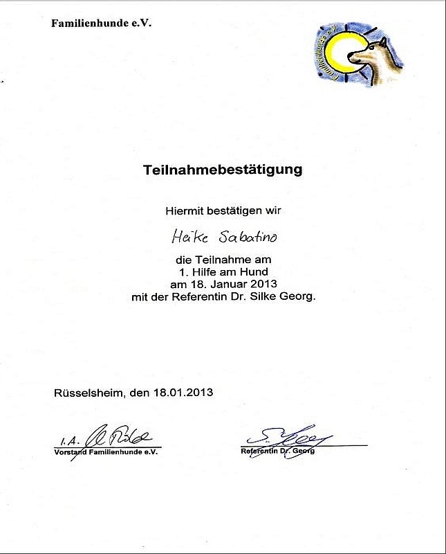 Weiterhin war ich im Praktikum bei der Tierärztin Fr. Dr. Kirsten König in Flörsheim/Main, dieses habe ich um einen Erste Hilfe-Lehrgang für den Hund ergänzt.